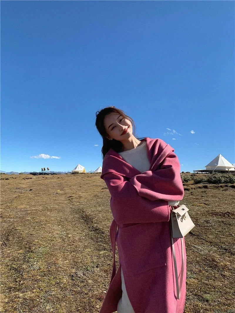 2024 Mid-Length Autumn and Winter Hooded Double Sided Cotton Cashmere Coat Female 100% Wool Loose Thick Woolen Coat
