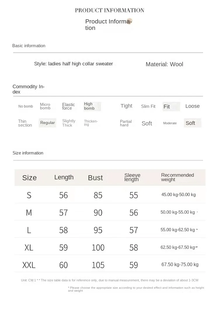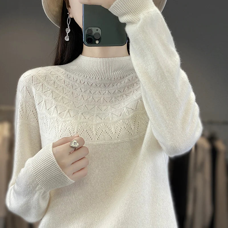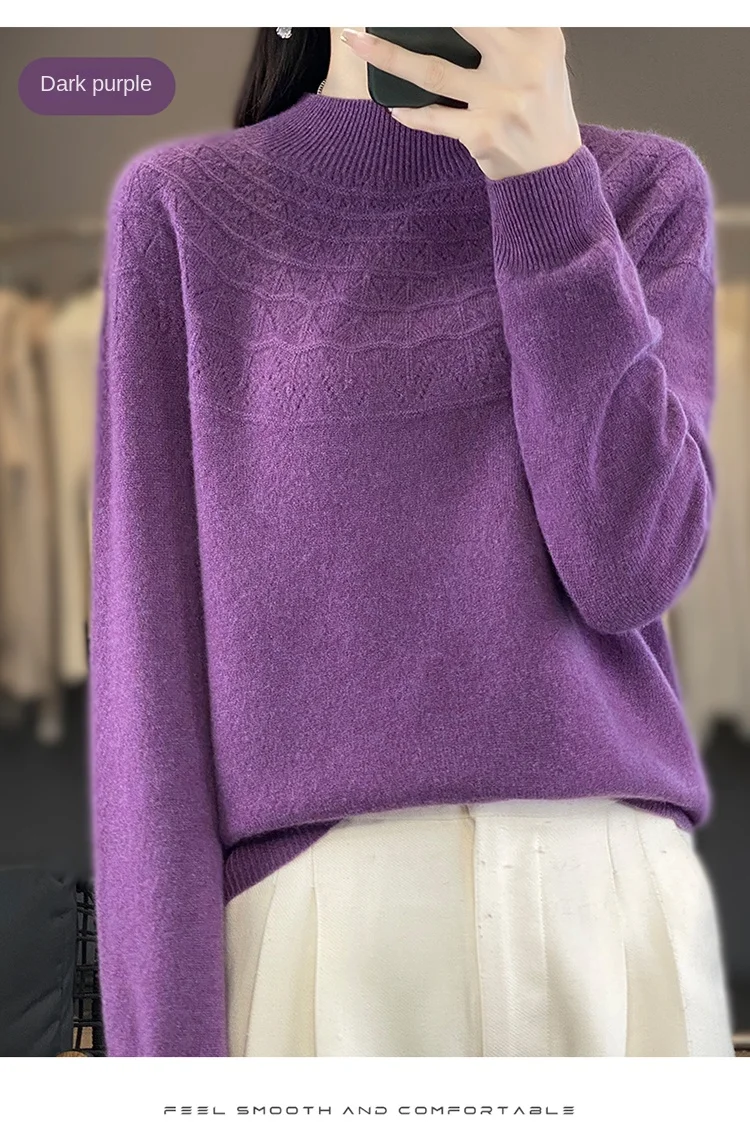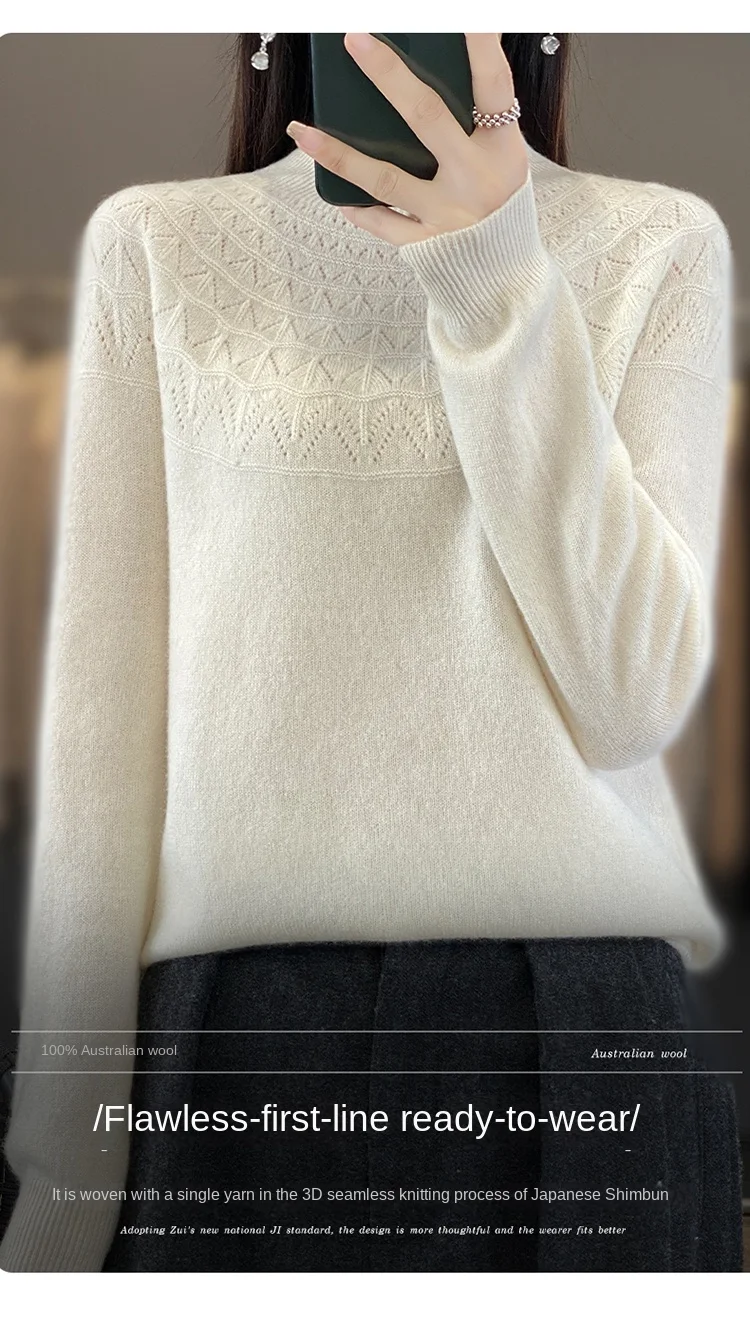 2024 New Line Of Garment Hollowed Out Half Height Women's High-grade Woolen Sweater 100% Pure Wool Multi-color Option WQ