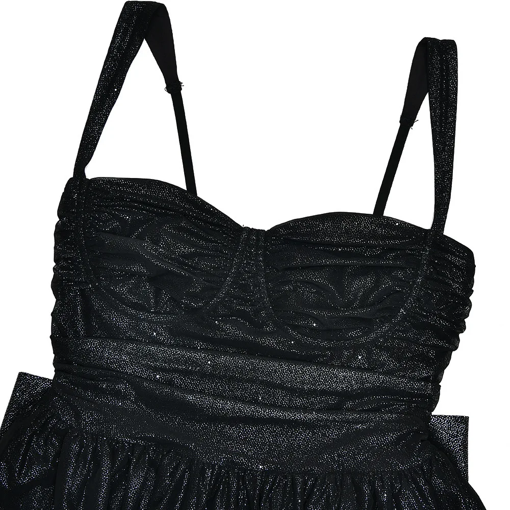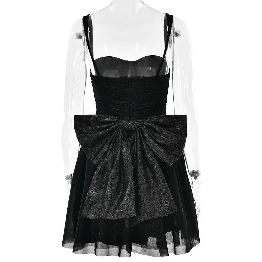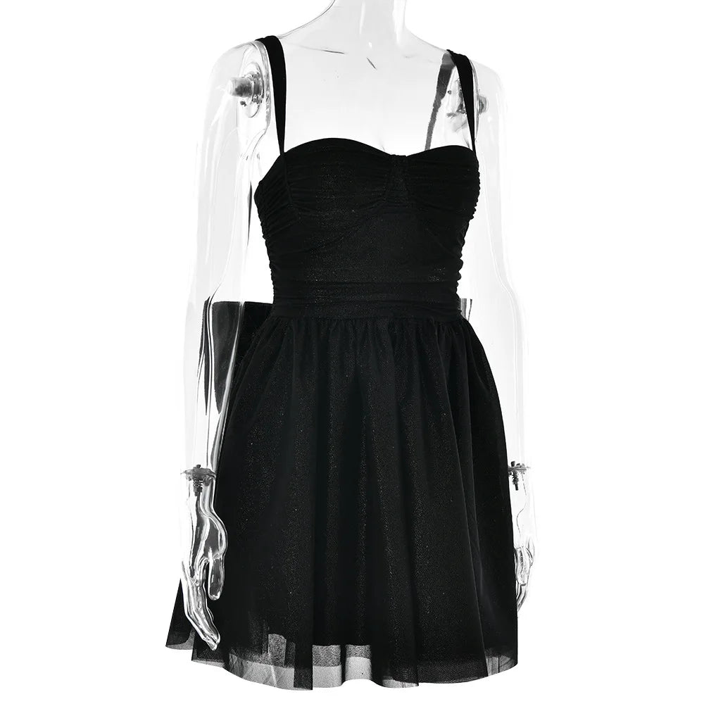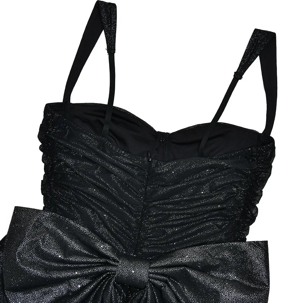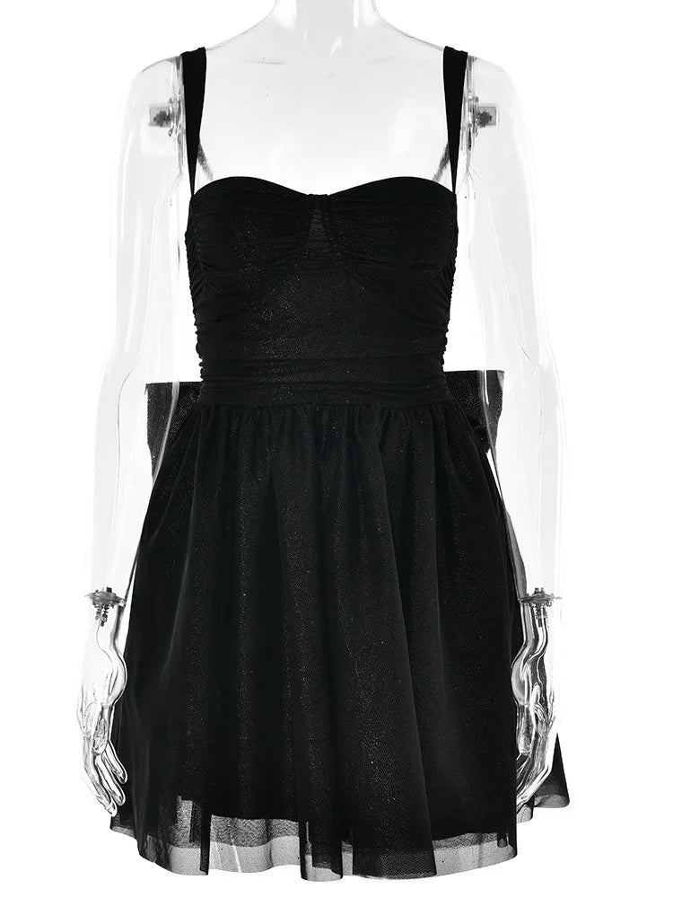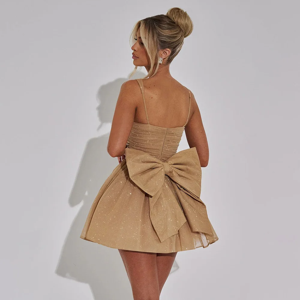 Articat Sexy Mesh Spaghetti Strap Double-layer Short For Women Elegant Sleeveless Backless Tight Shiny Bow Evening Dress 2025