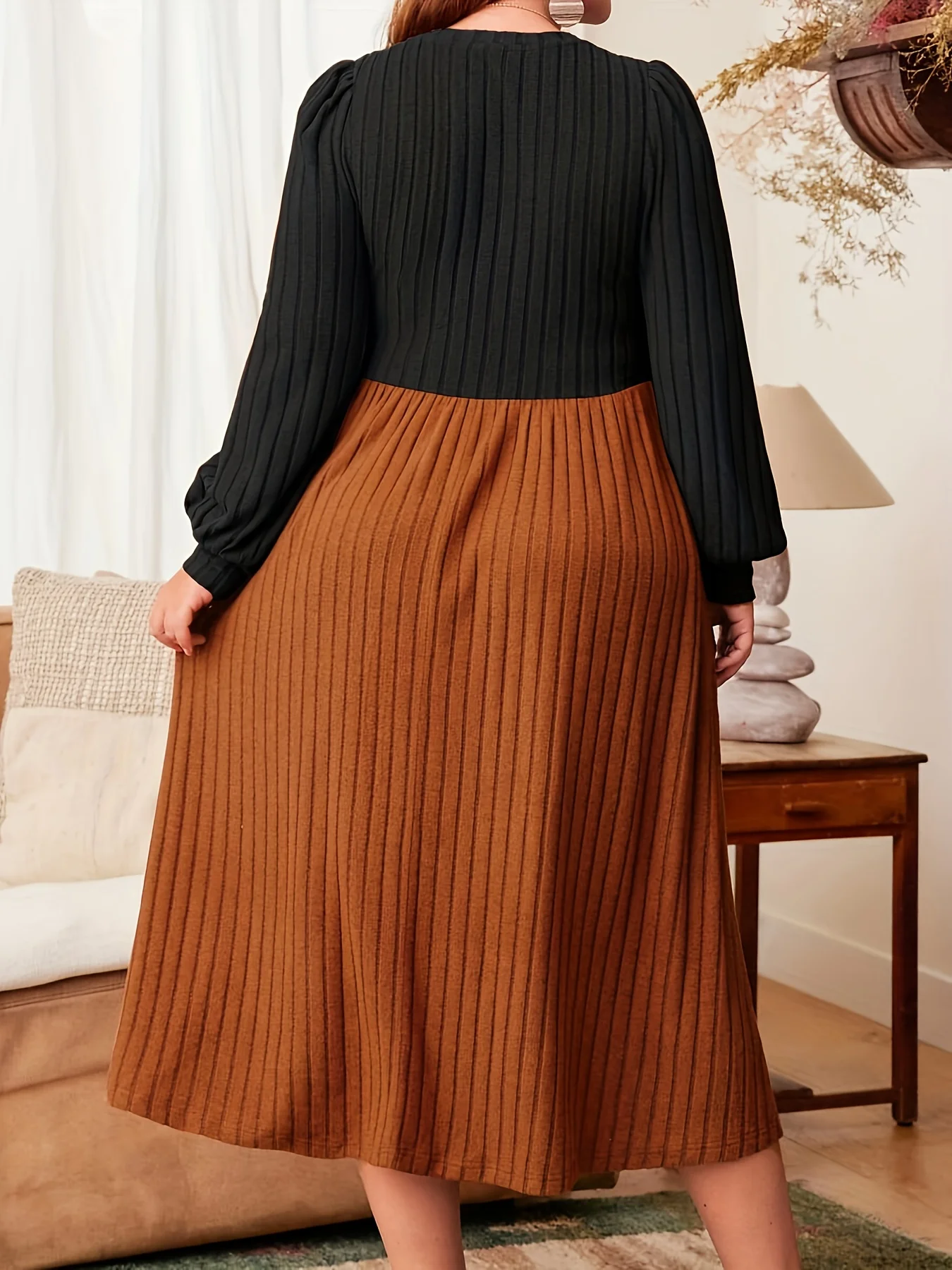 Autumn and winter style large size contrast color stitching long skirt round neck long sleeves slimming and elegant dress