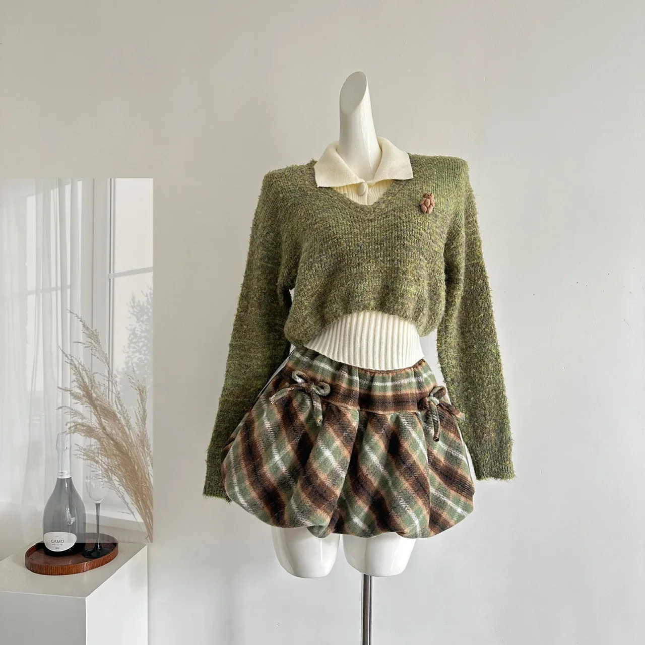 Autumn Winter Korean Cute Knitt 3 Piece Set Women Y2k Outfits Long Sleeve Crop Sweater + Knit Lapel Tank Tops + Mini Plaid Skirt