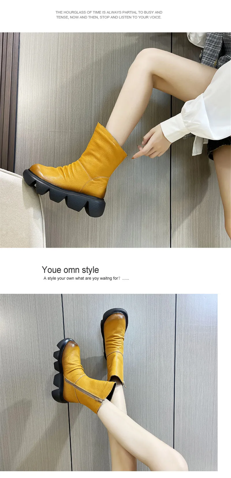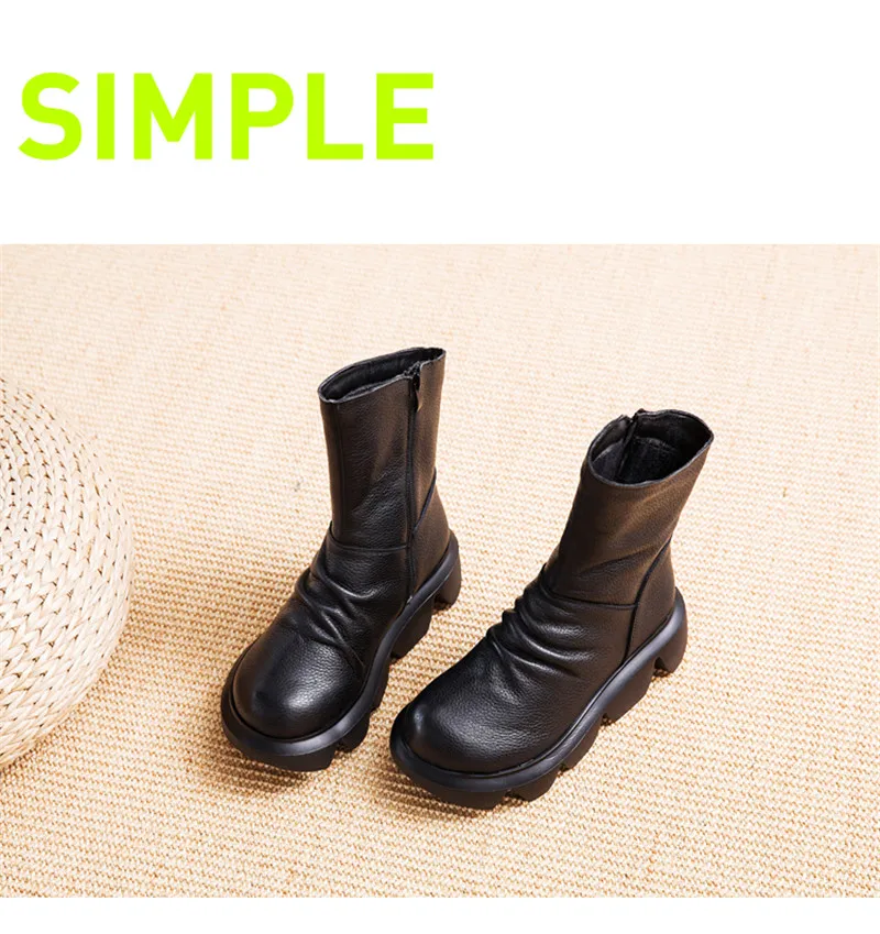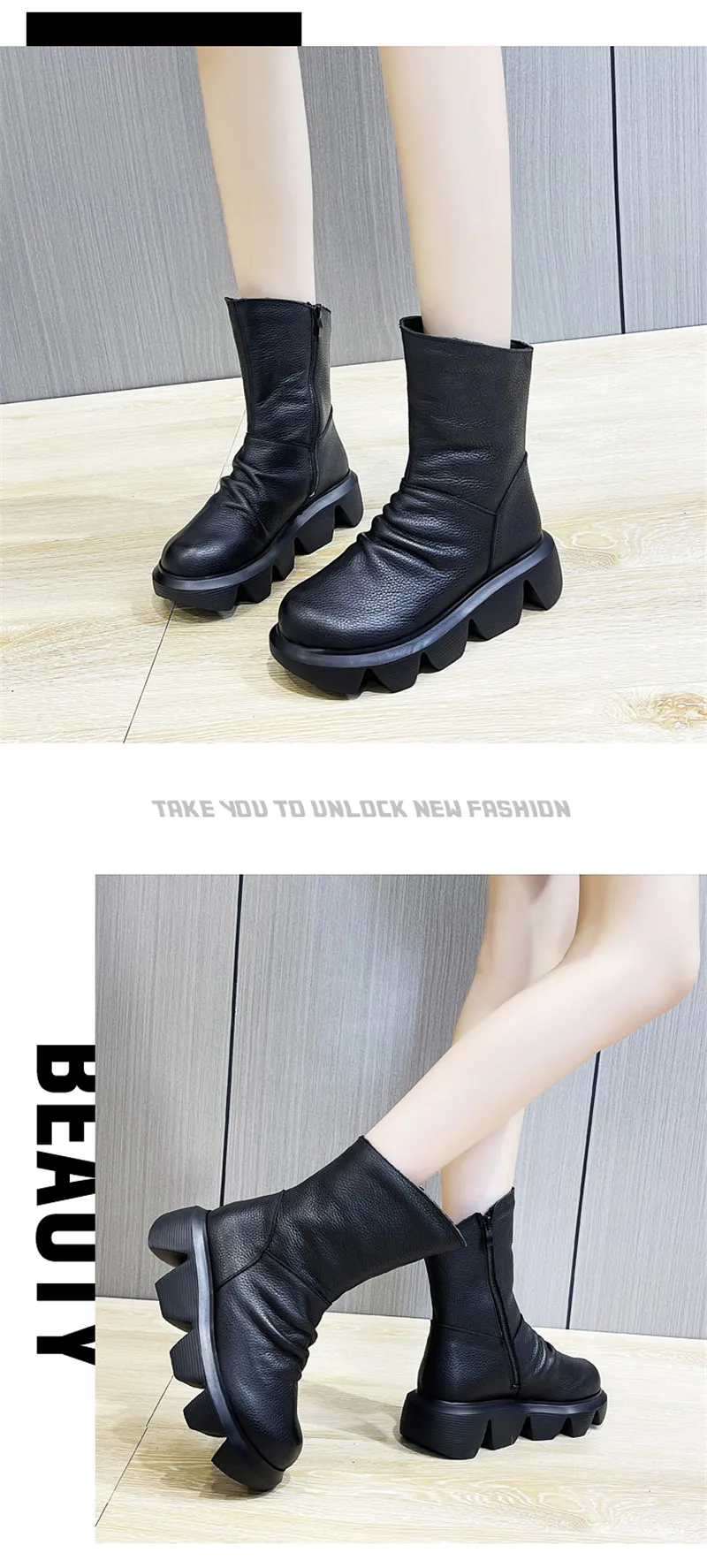 BEYARNE Ankle Boots Women Genuine Cow Leather Platform Bootie Side Zipper Soft Comfortable Autumn Winter Ladies Shoes Handmade