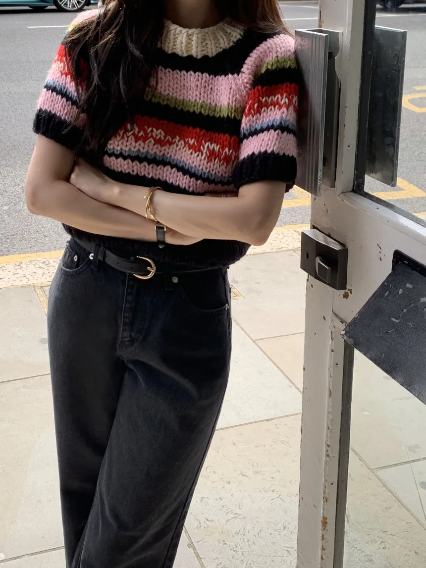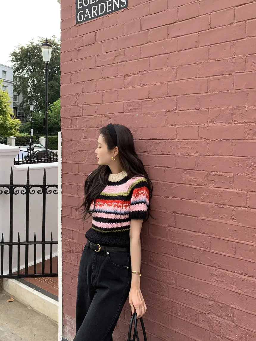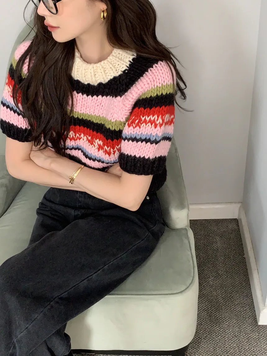Chic Vintage Heavyweight Knitted Loose ort Sve Striped Sweater for Women Summer Collection oulder Sve