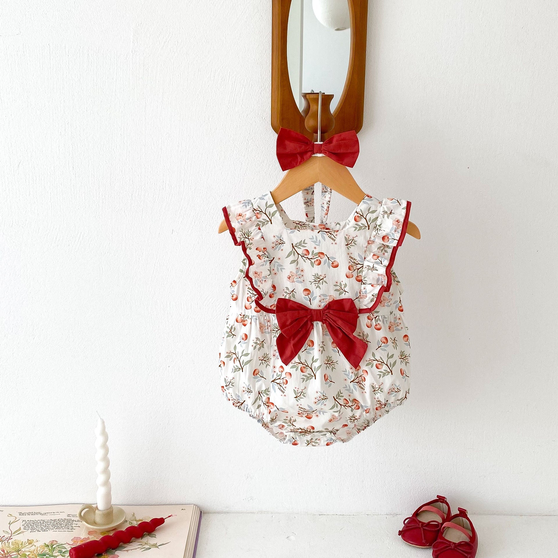 This elegant summer onesie for baby girls features a charming cherry pattern that adds a playful yet refined touch. Its square neckline and sleeveless design provide comfort and breathability for warm days, while the oversized bow enhances its sophisticated appeal. Perfect for stylish little ones, this piece combines charming details with practical comfort for everyday wear.