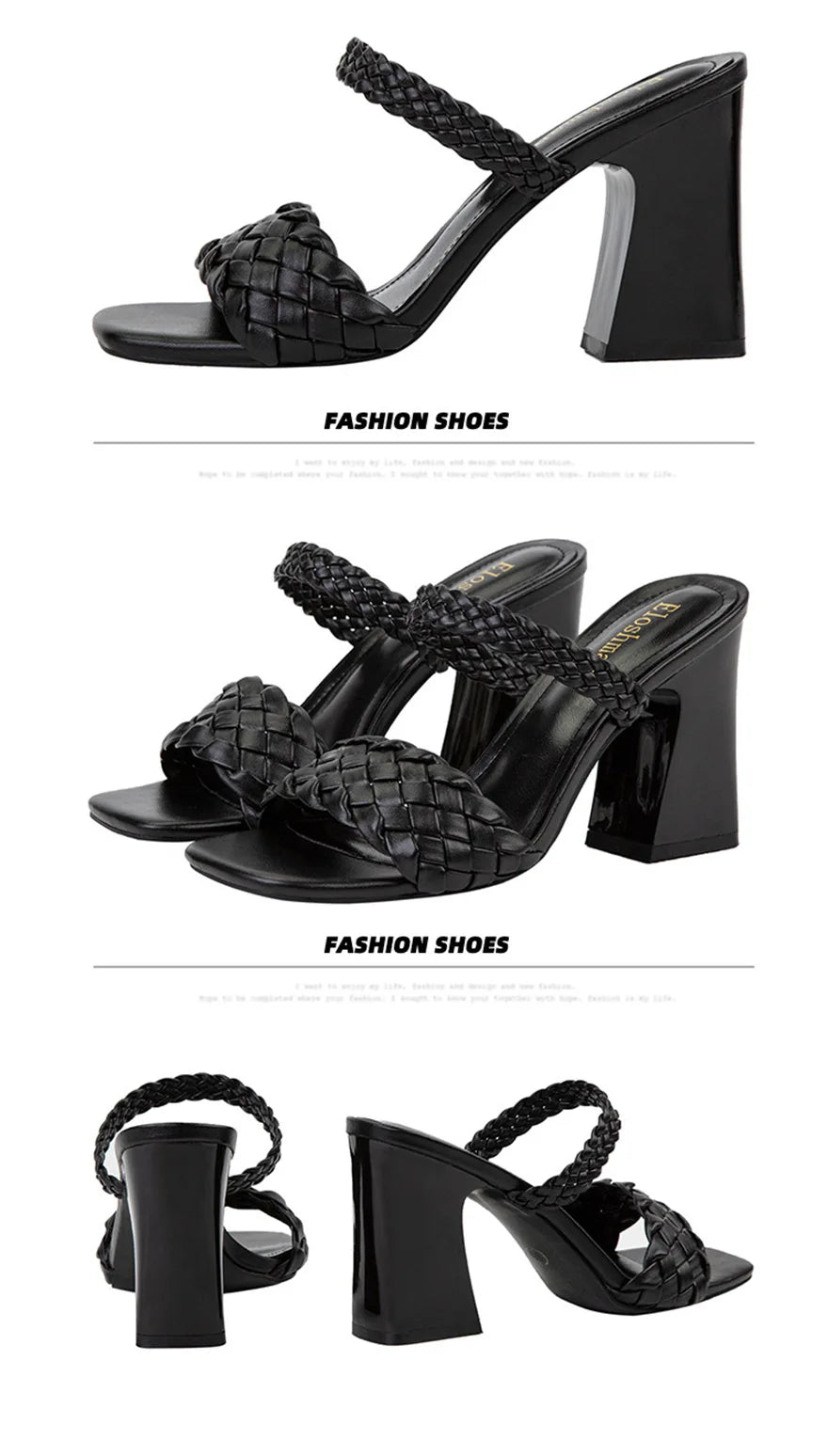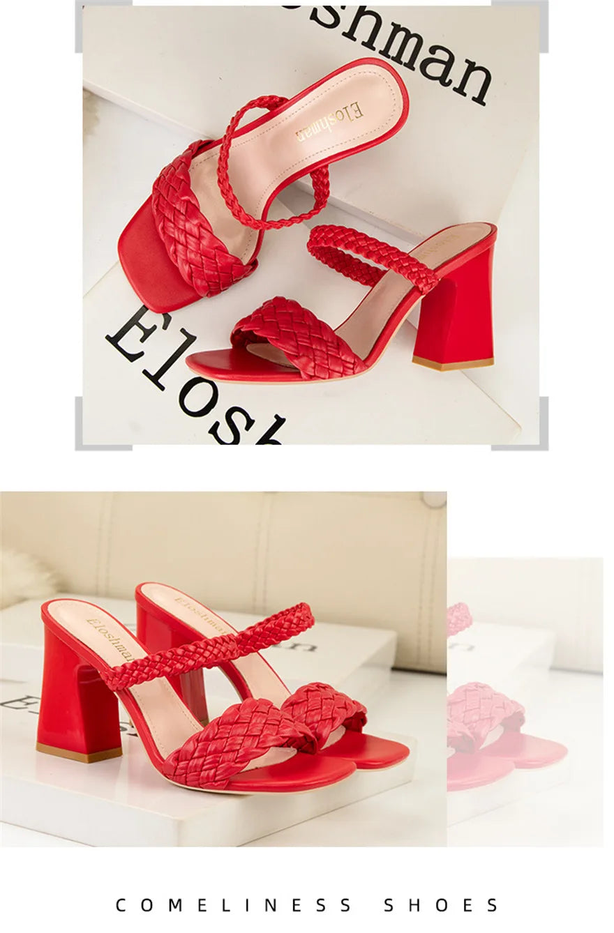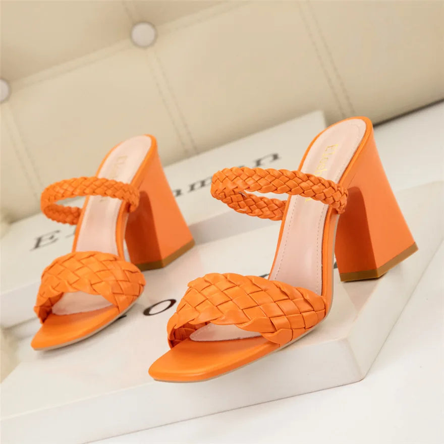 Fashion Weave Thick Heel Women's Slippers Square Toe Summer Casual Ladies Slides Red Orange Shoes Slip On Beach Sexy Pumps Woman