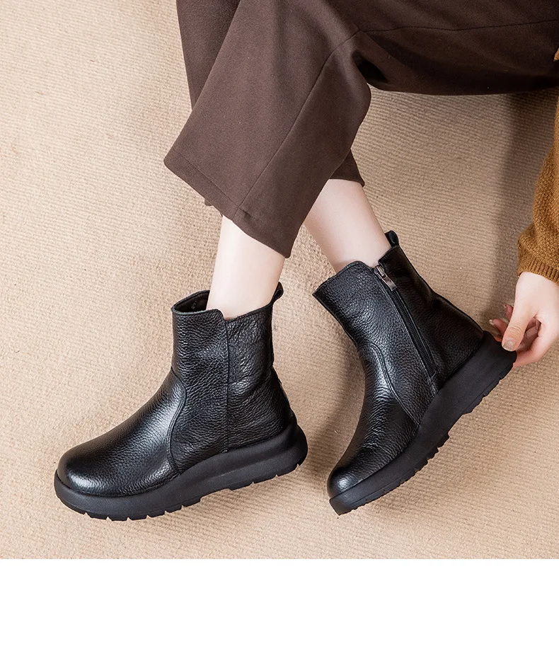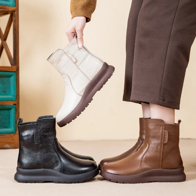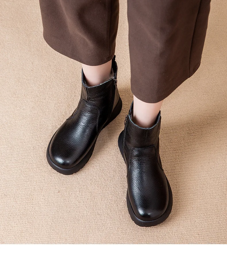 GKTINOO 2025 Winter New Genuine Leather Side Zipper Flat Bottom Women's Short Boots Soft Sole Plush Warm Cotton Shoes
