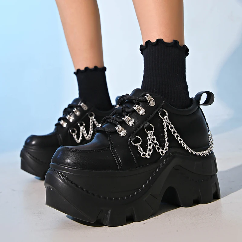 Gothic Punk Chunky Sneakers for Women Black Chain Decor Platform Sports Shoes Woman Thick Sole Non Slip Punk Sneakers Plus Size