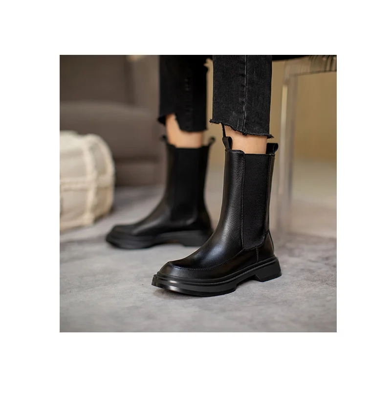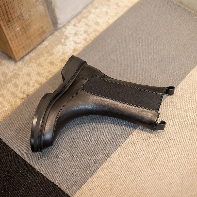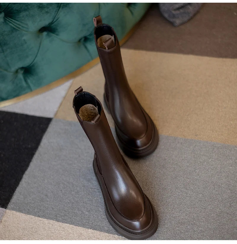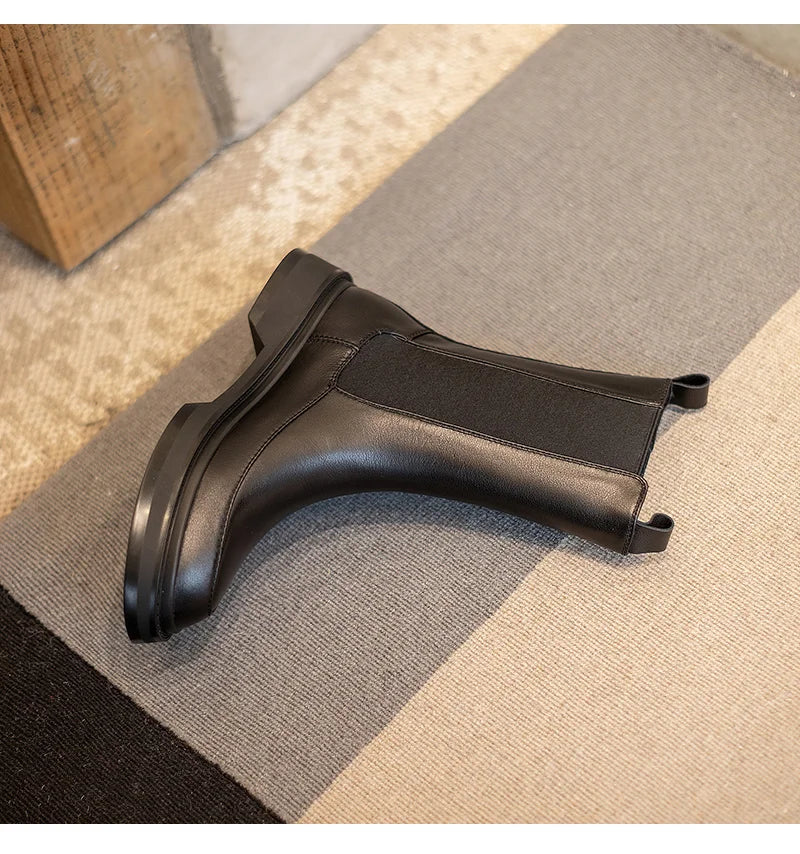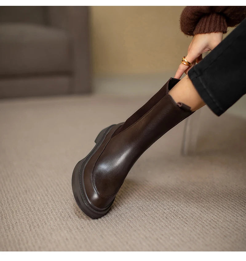 Hot Genuine Leather Women's Boots Retro British Style Slip-On Chelsea Boots Fashion Ankle Boots Round Toe Flat with Women Shoes