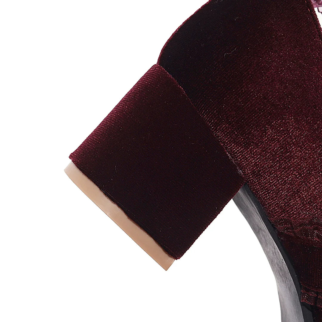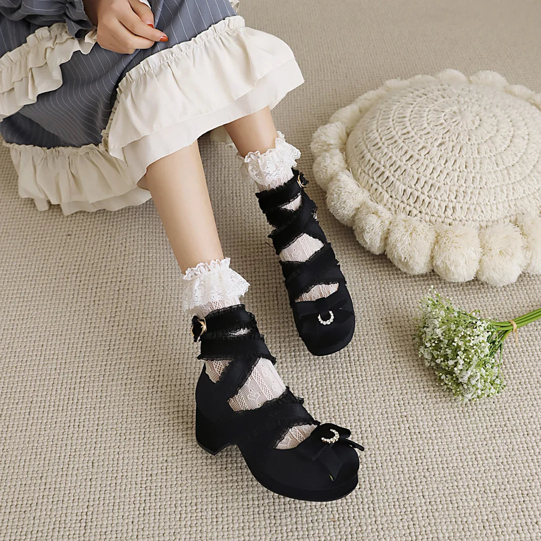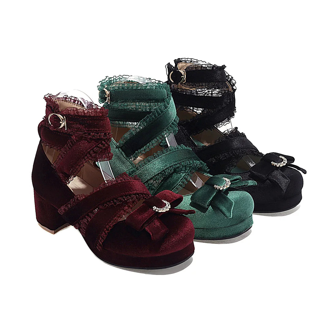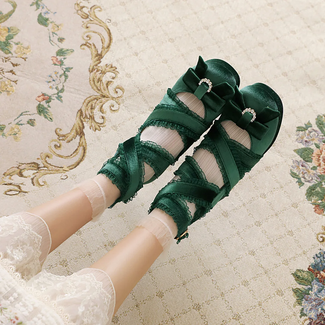 JK Fairy Lolita Shoes Flock Gold Velvet Bow Platform Mary Jane Cross Strap Pumps Gladiator Cosplay Party Red Green Black