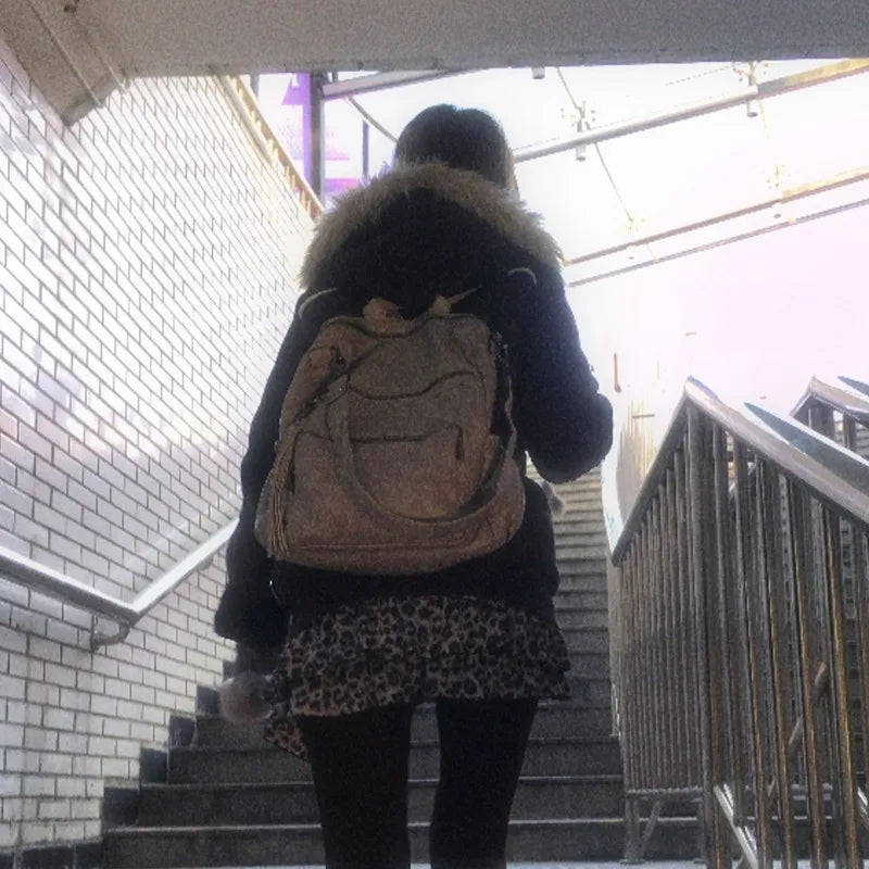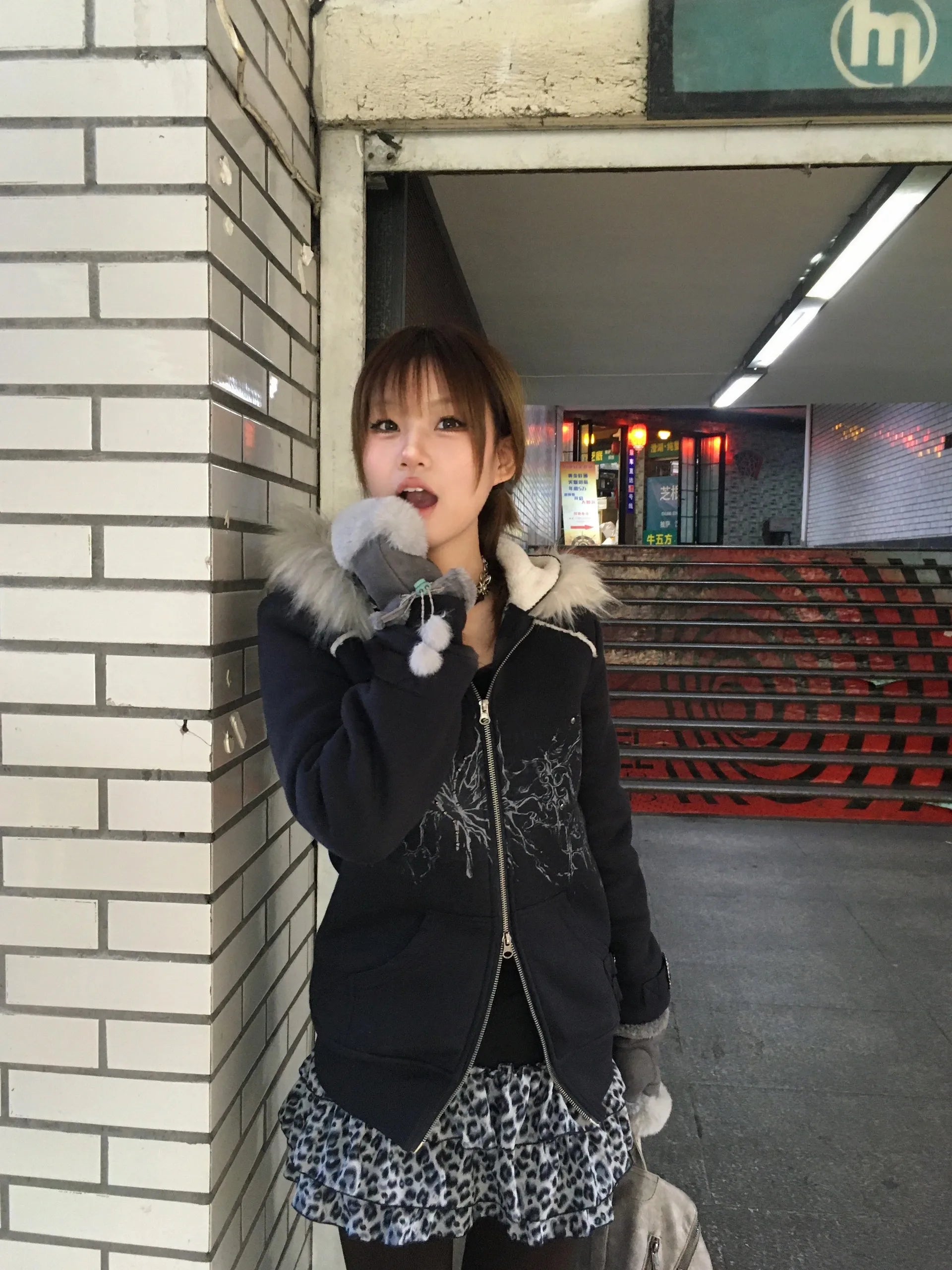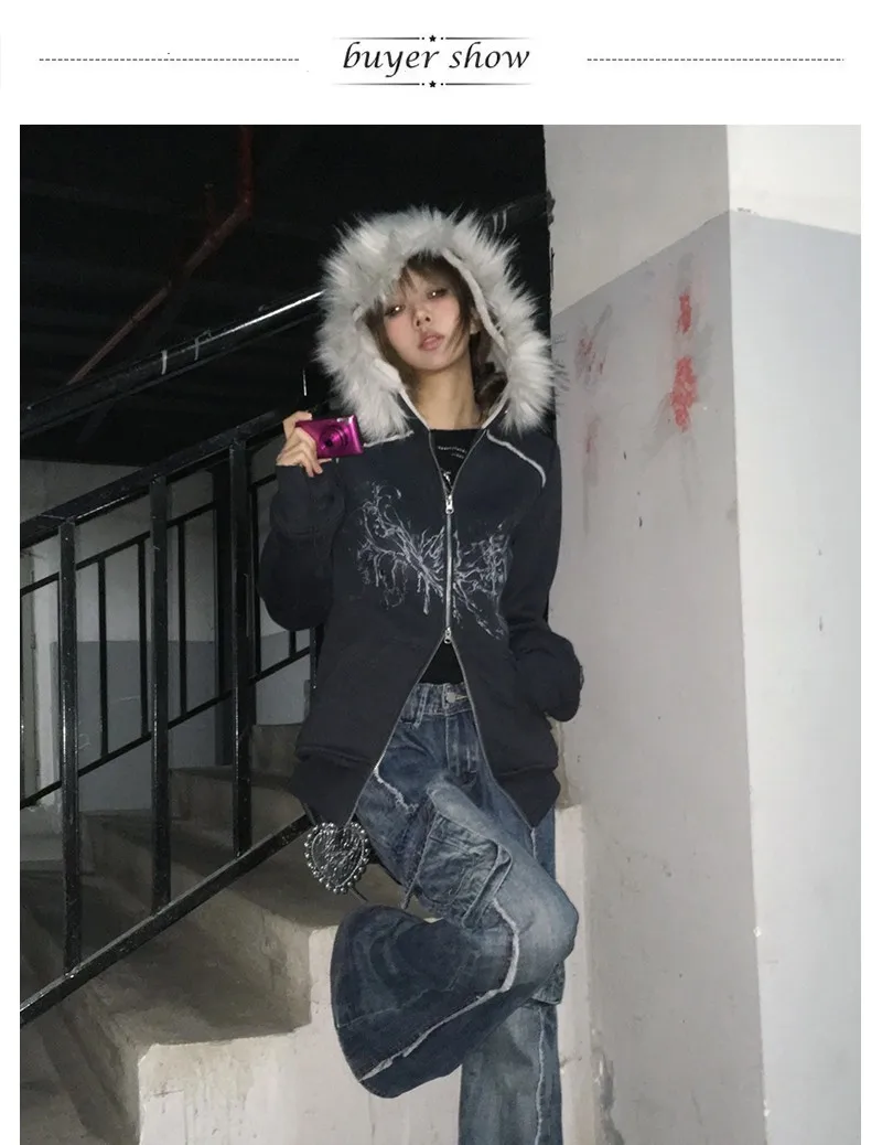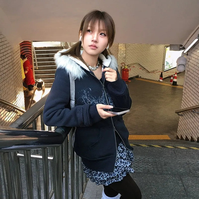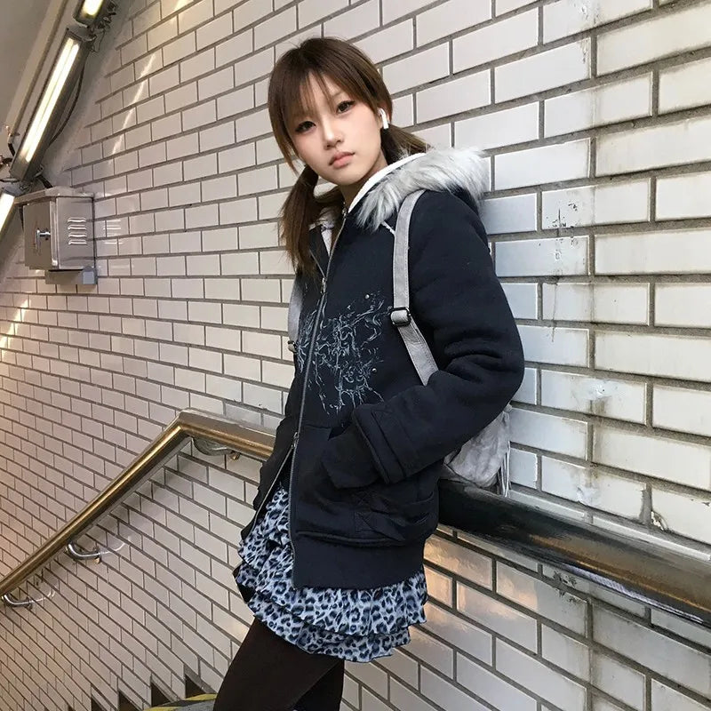 Karrram Japanese Y2k Fur Hooded Coat Grunge Aesthetics Tattoo Print Jacket Vintage Harajuku Double Zipper Outerwear Trashy 2000s