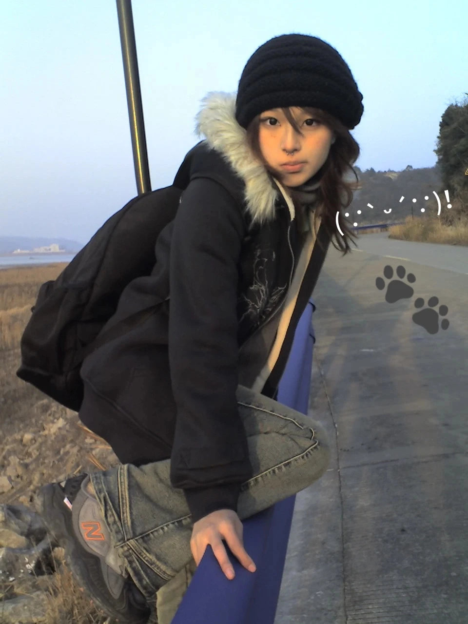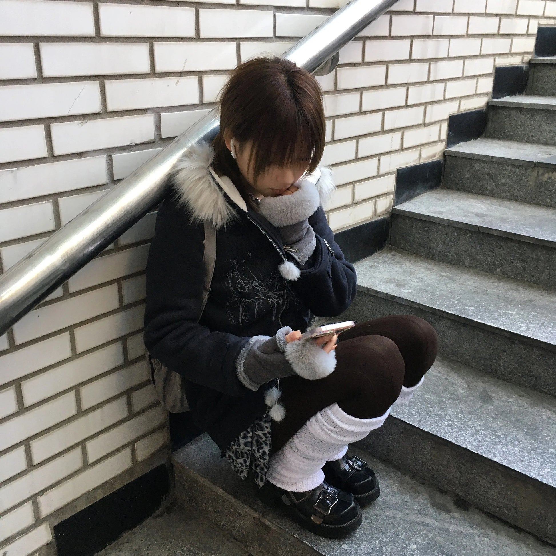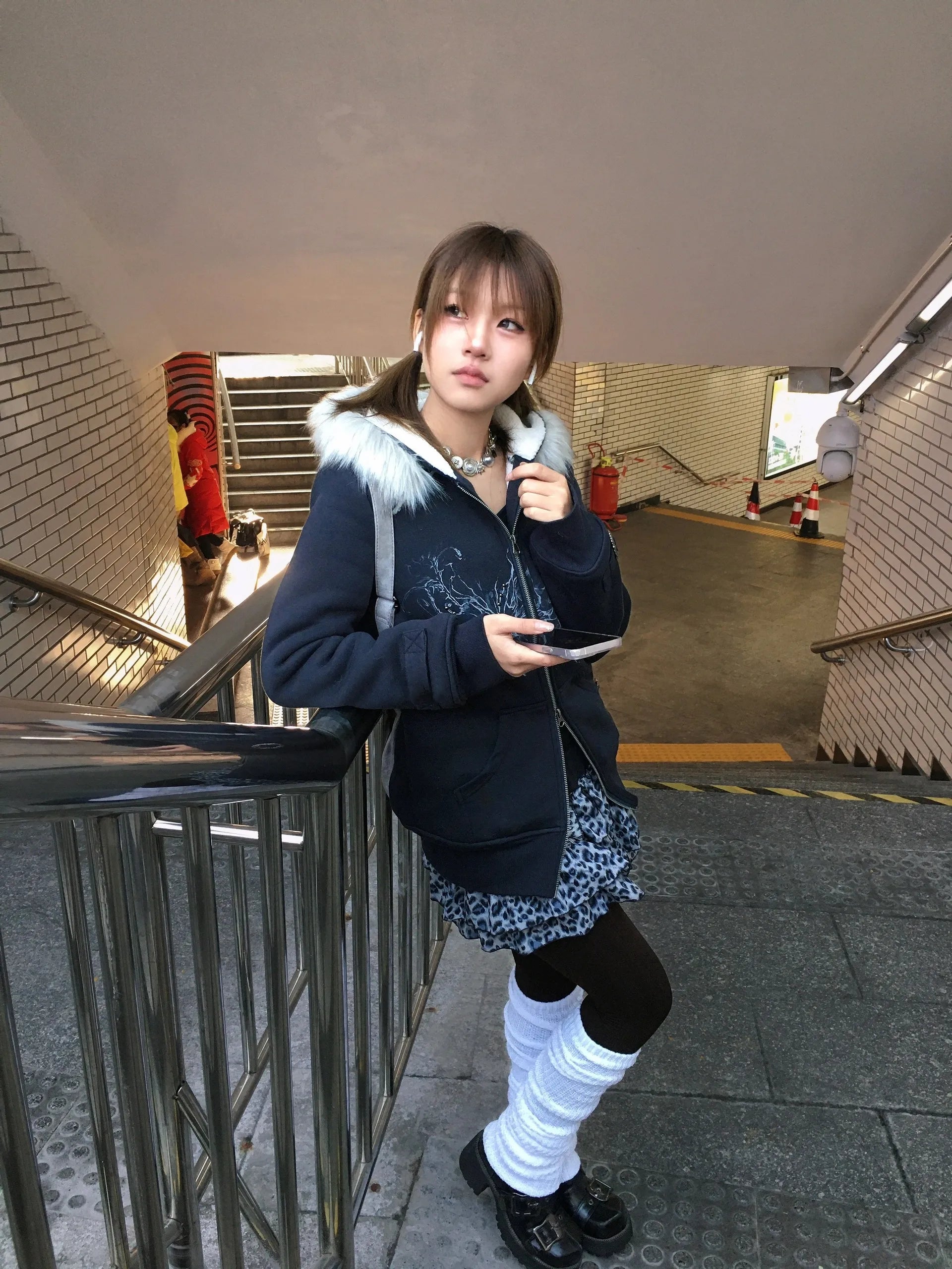 Karrram Japanese Y2k Fur Hooded Coat Grunge Aesthetics Tattoo Print Jacket Vintage Harajuku Double Zipper Outerwear Trashy 2000s