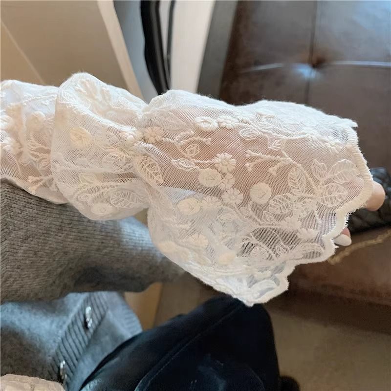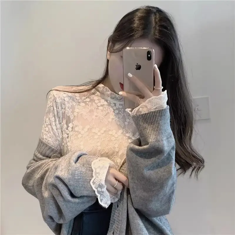 Lace Long Sleeve Shirts Women Plus-velvet Slim Basic Mock Neck Hollow Embroidery Autumn Winter Tops Gentle Elegant Chic Female