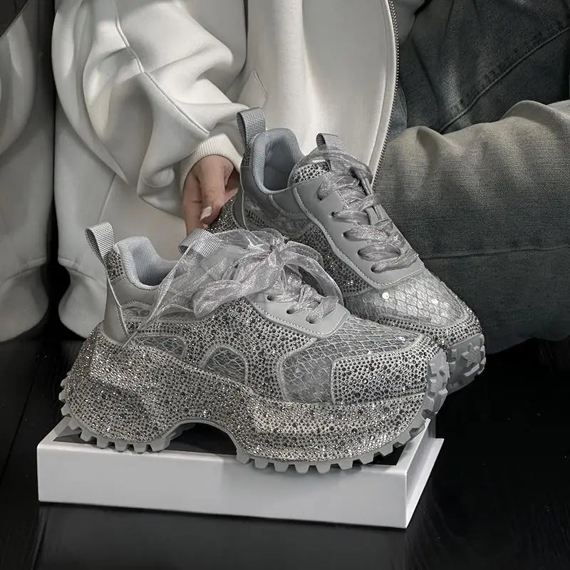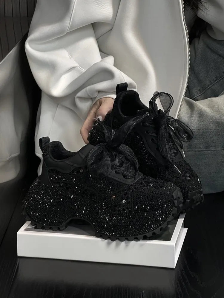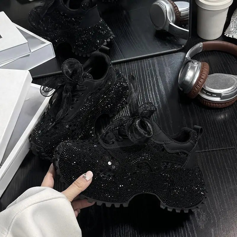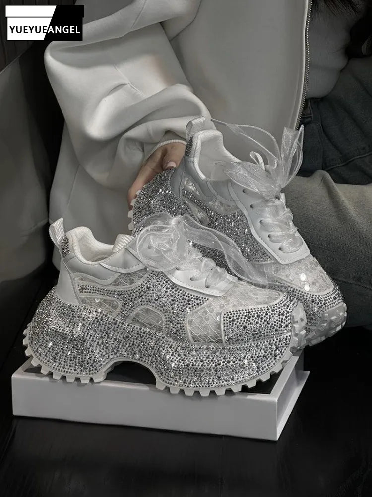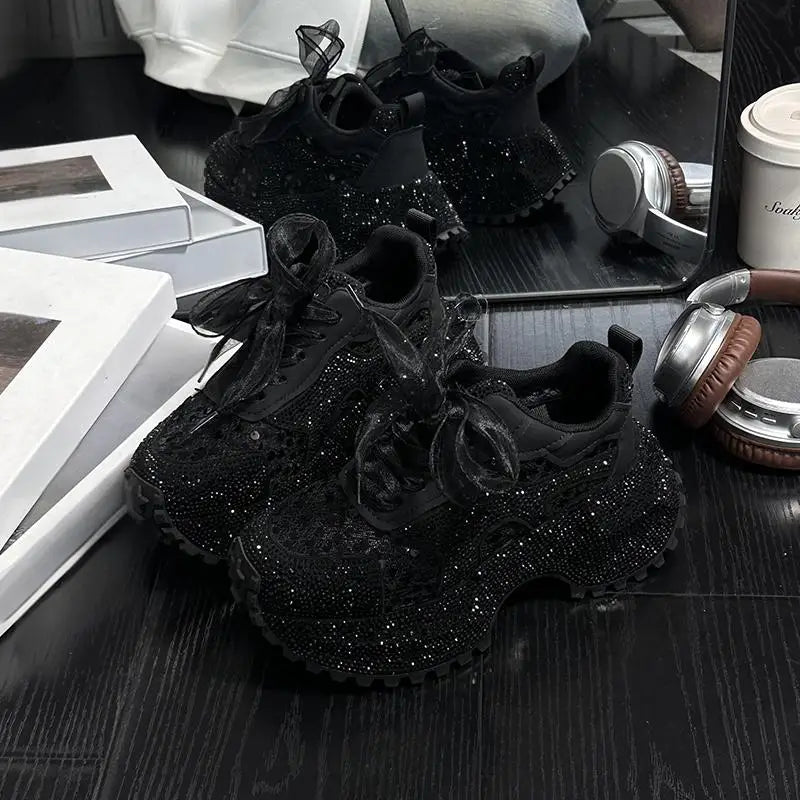 Leisure Sneakers Lace Up Breathable Platform Women Pumps High Heel Round Toe Solid Color Daily Diamonds Bowknot Comfortable