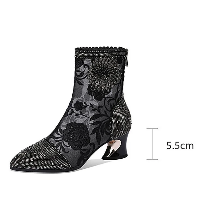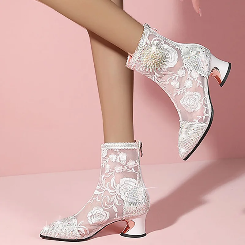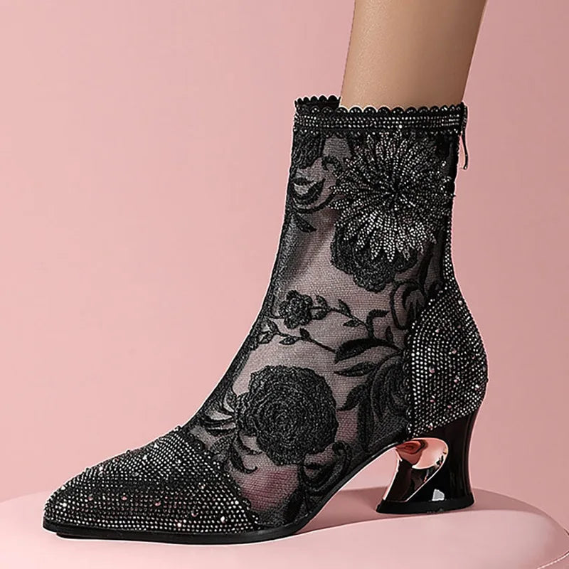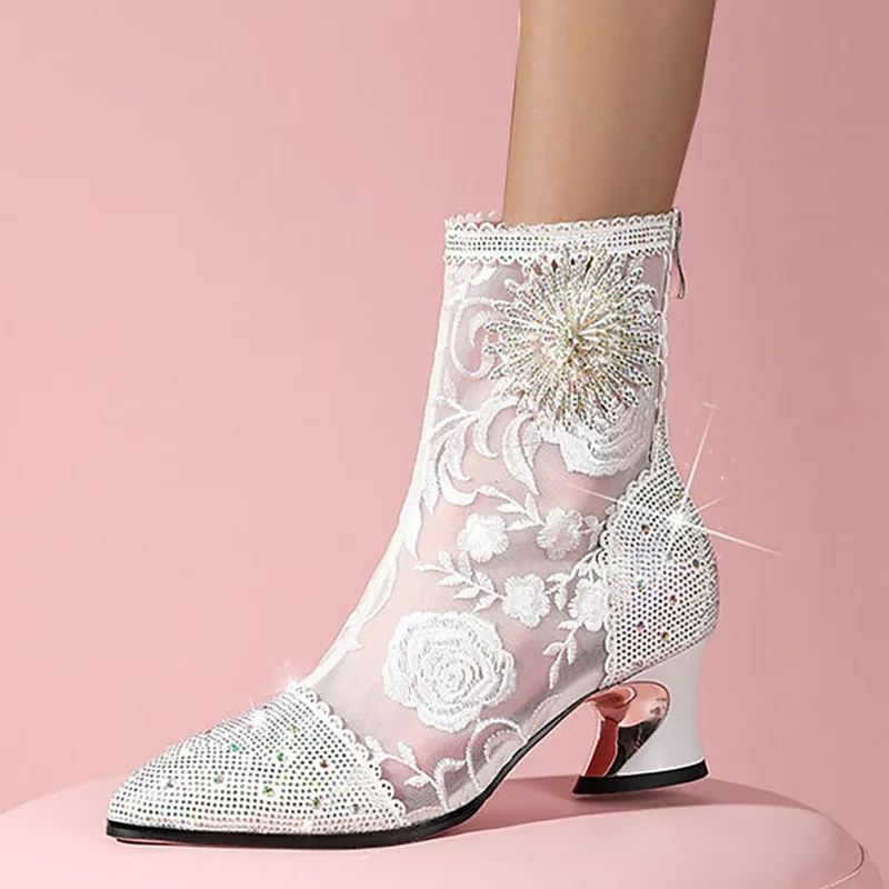 Luxury Crystal Pointed Toe Fashion Boots Women Thick Heel Zipper Ladies Party Shoes Black White Lace Mesh Sexy Female Ankle Boot