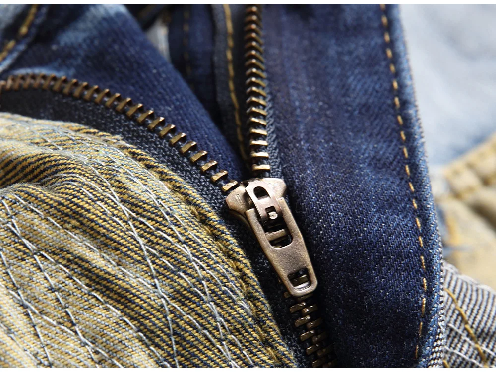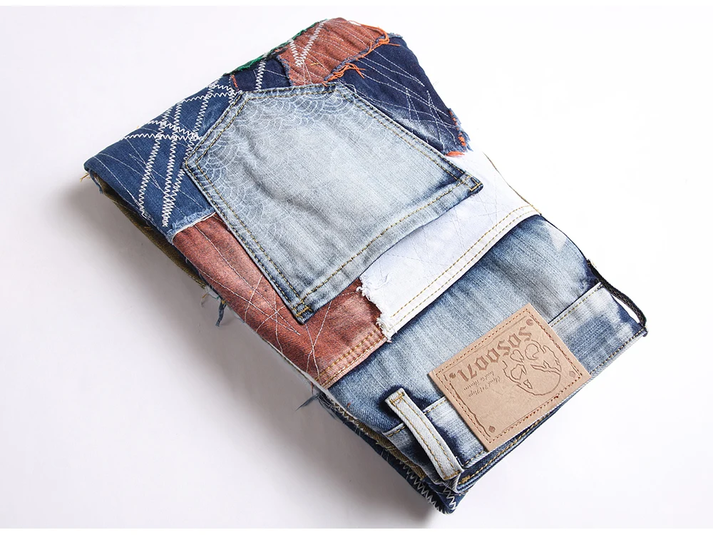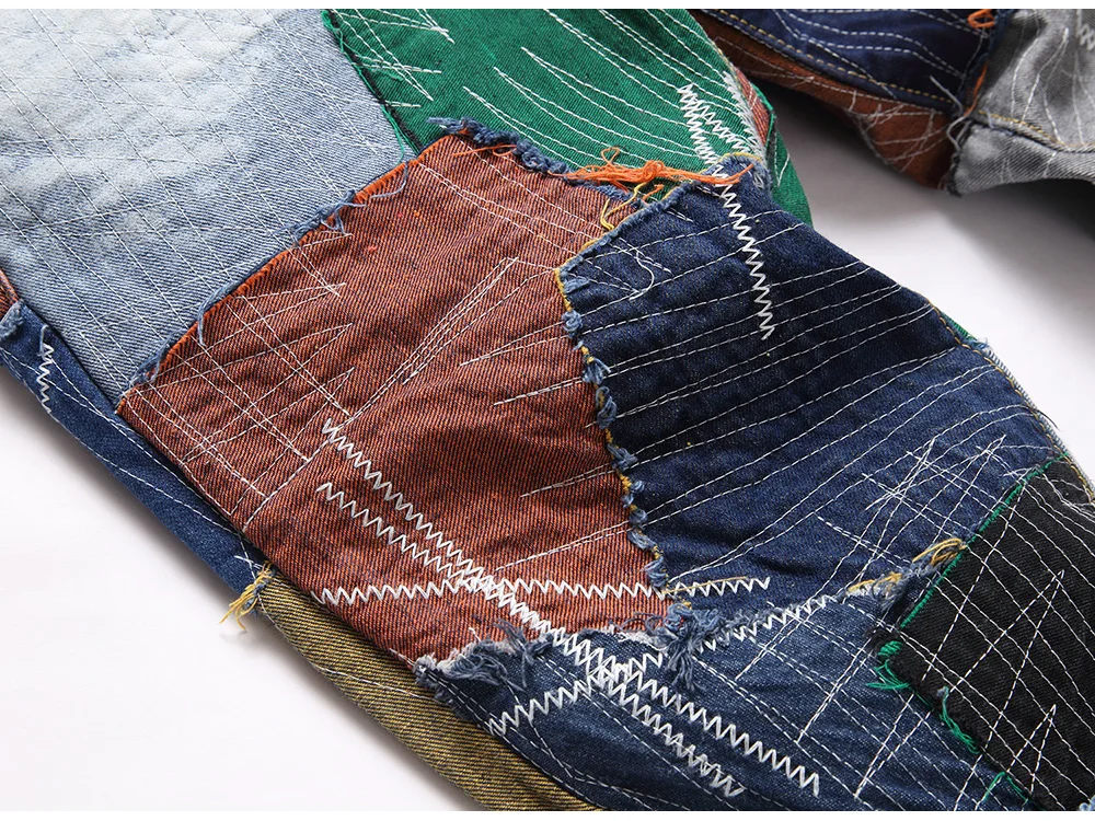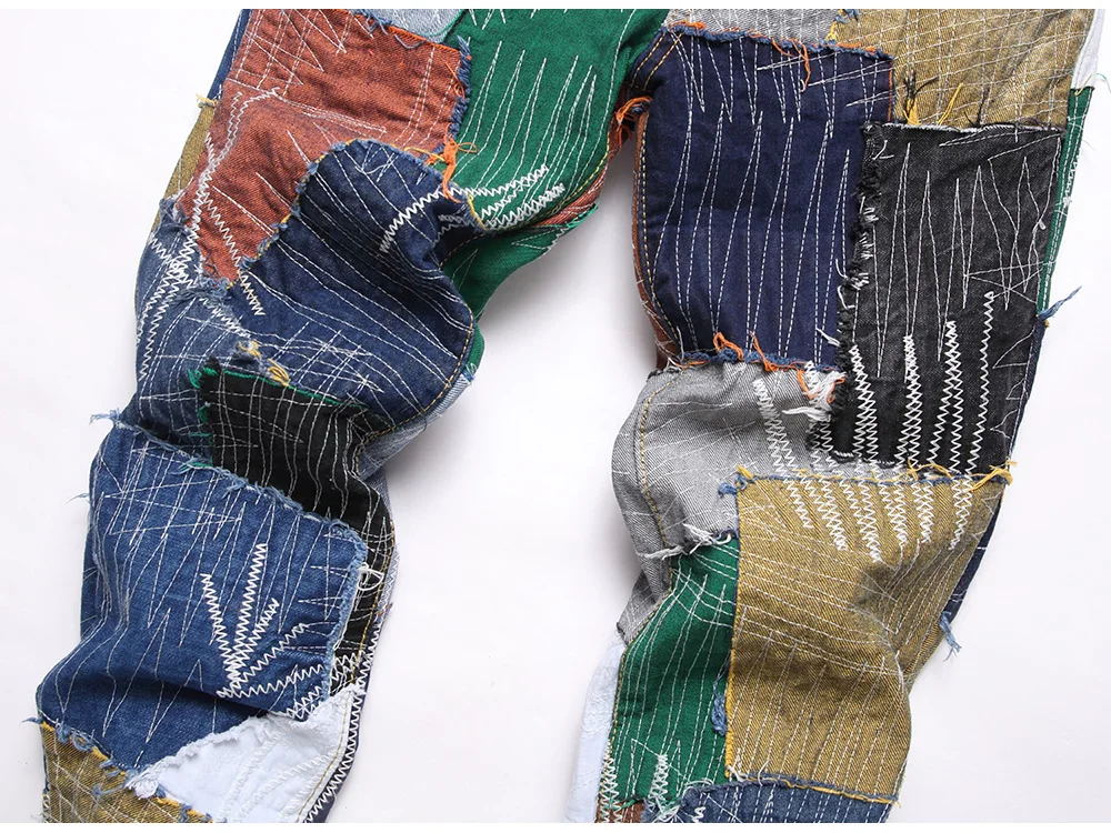 Men Patchwork Denim Jeans Release Hem Colorful Patches Embroidery Pants Non Stretch Cotton Slim Straight Trousers