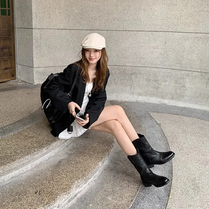 New Fashion Boots for Women Spring/Autumn Square Heel Female Mid-Calf Boots Ladies Slip-On Pointed Toe WESTERN Boots Women