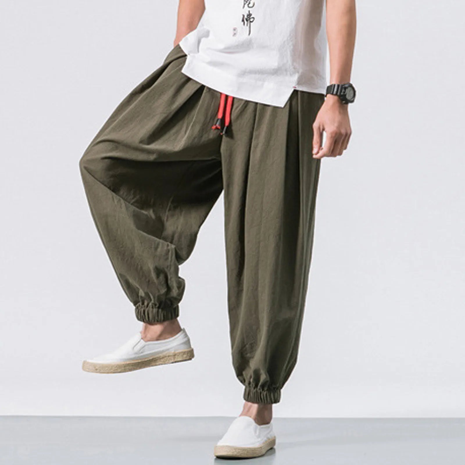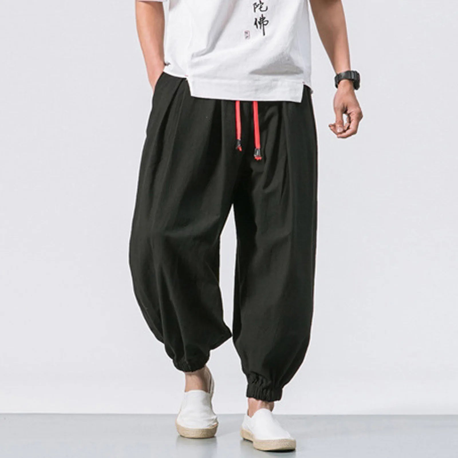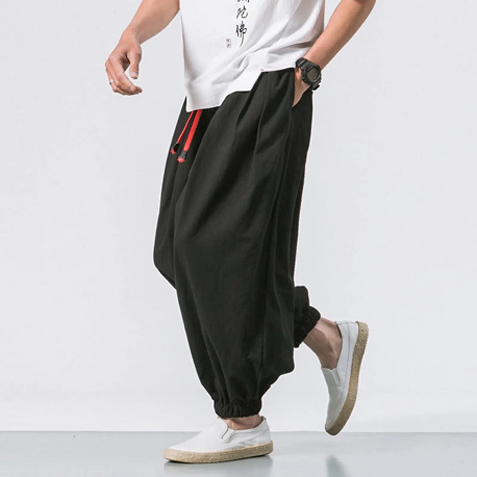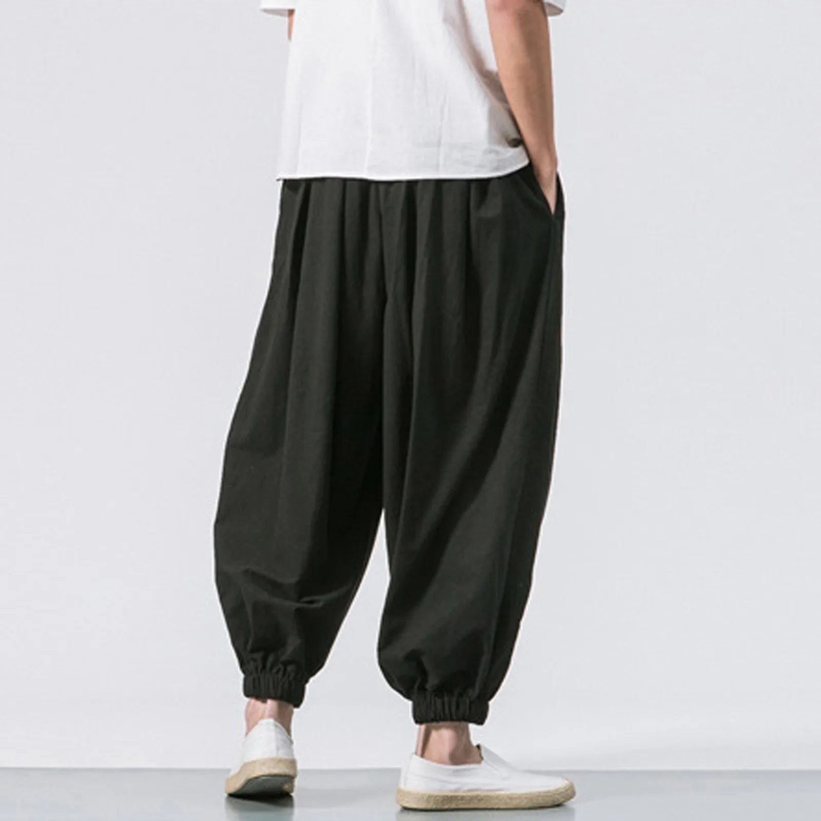 Men's Fashion Cotton Linen Casual Pants Loose Wide Legs Elastic Leggings