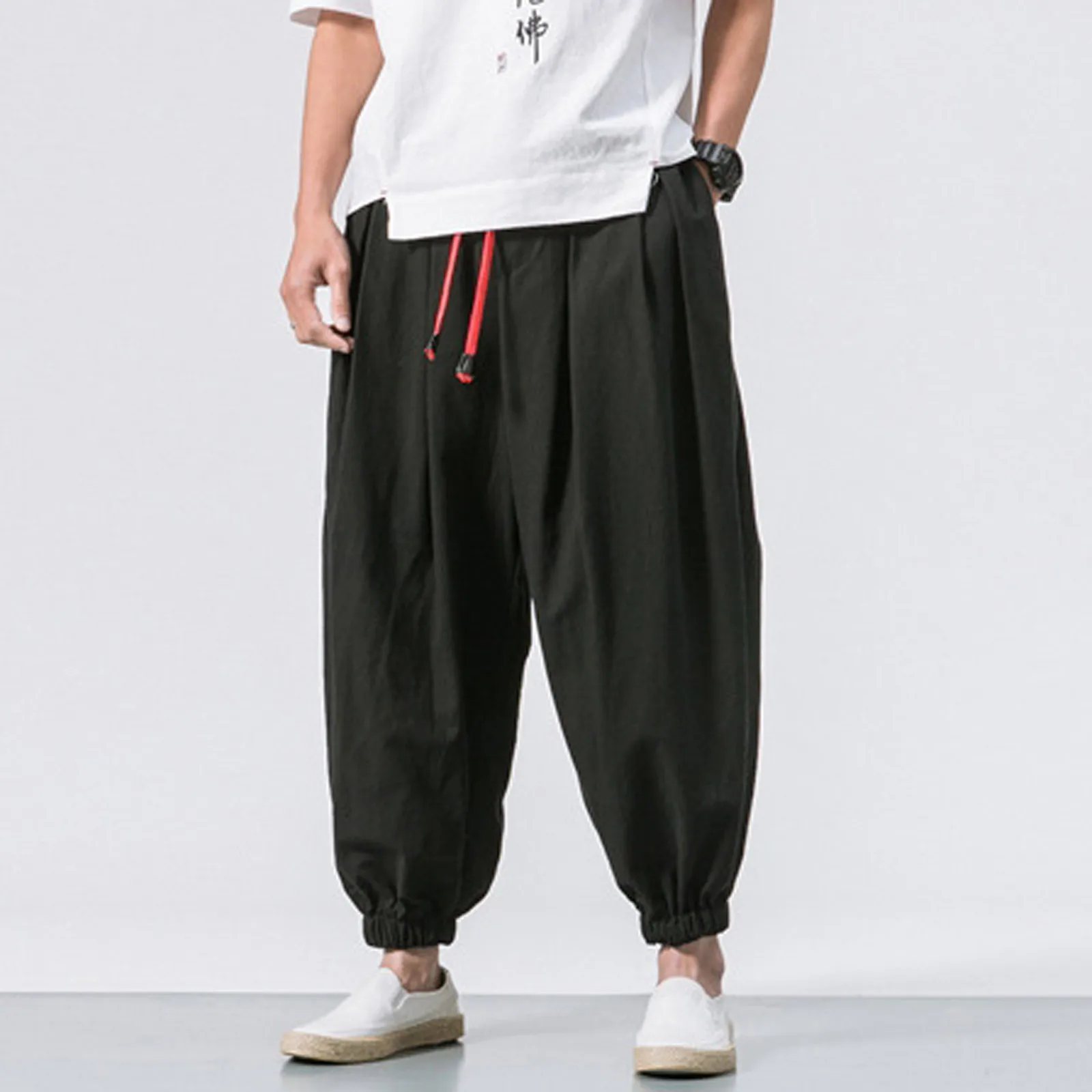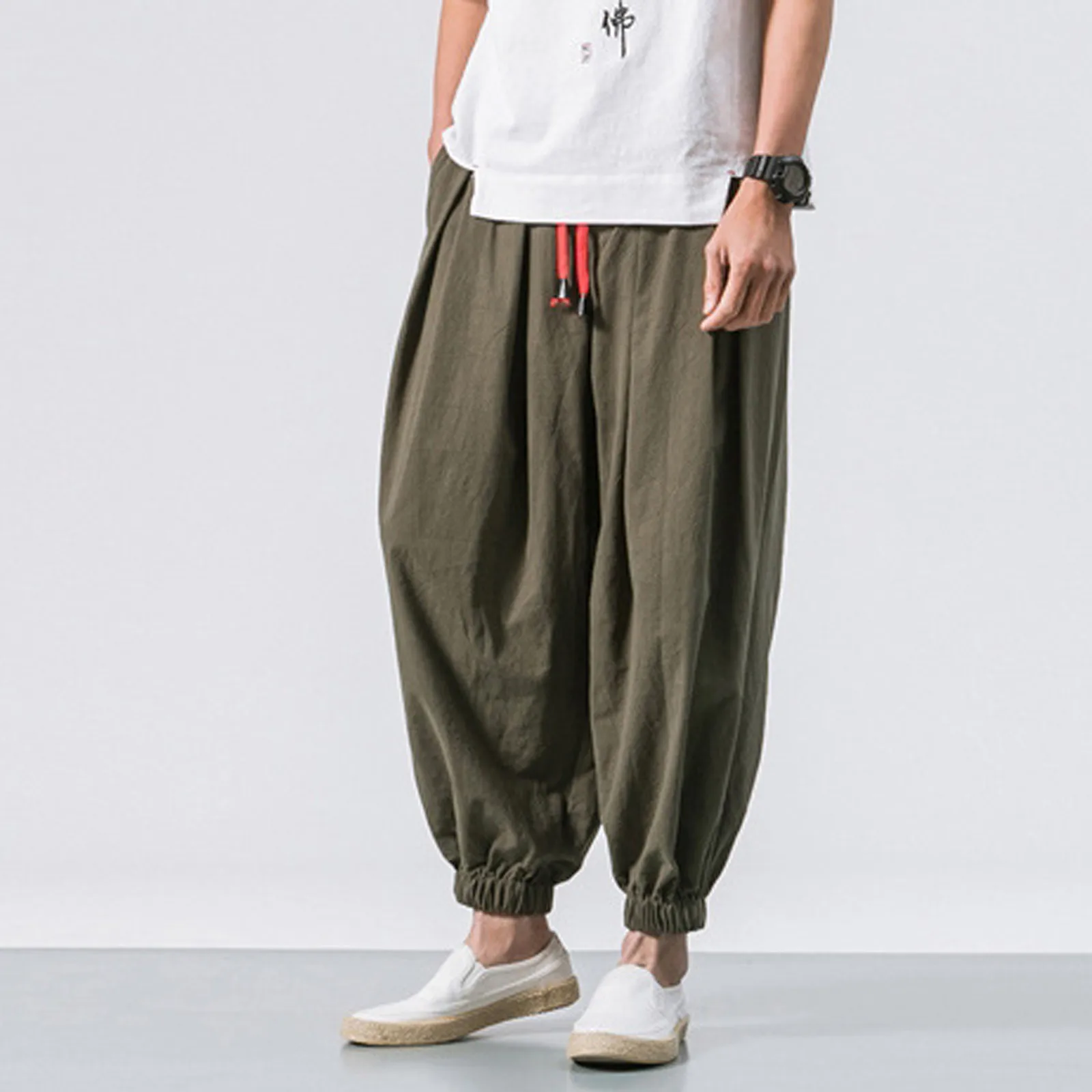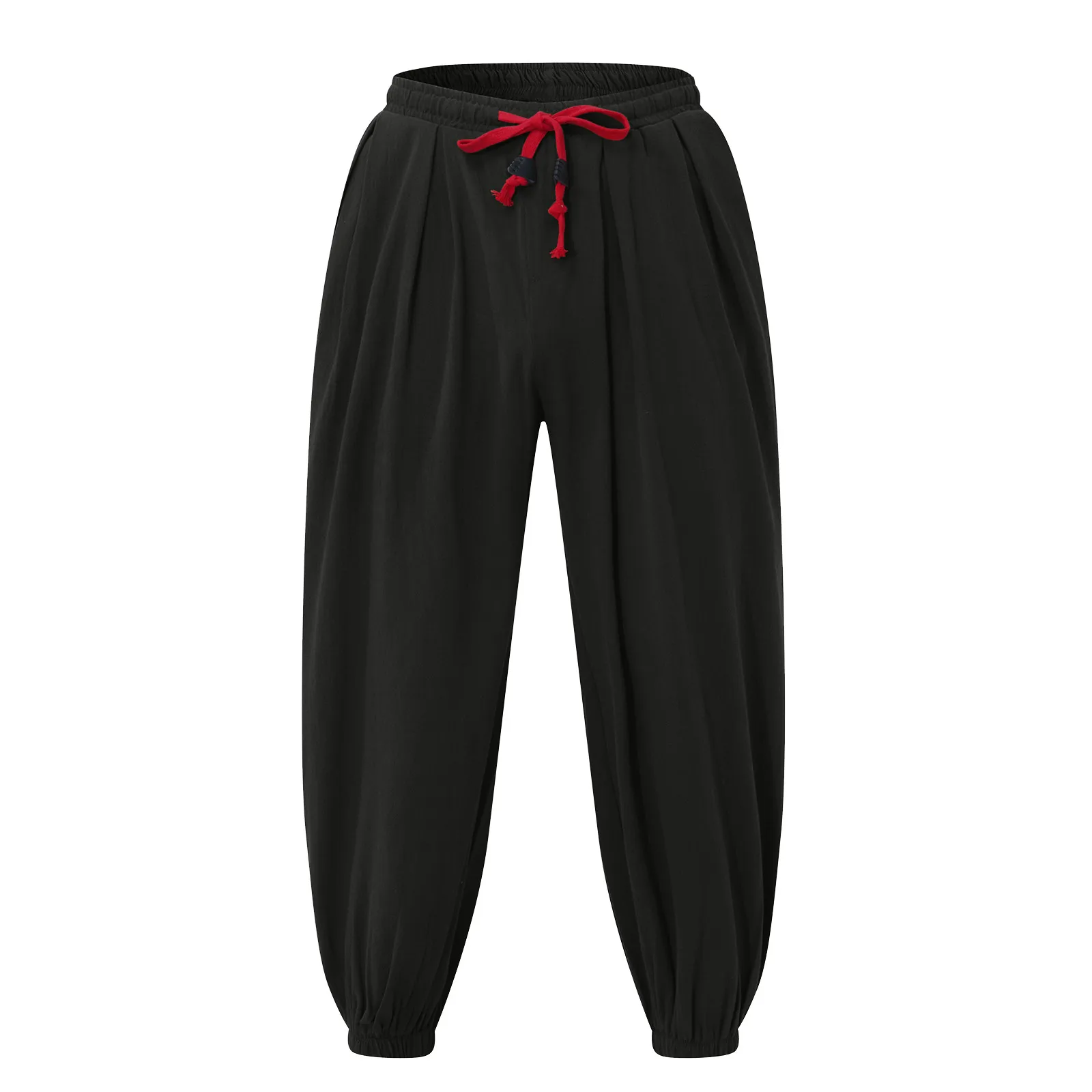Men's Fashion Cotton Linen Casual Pants Loose Wide Legs Elastic Leggings