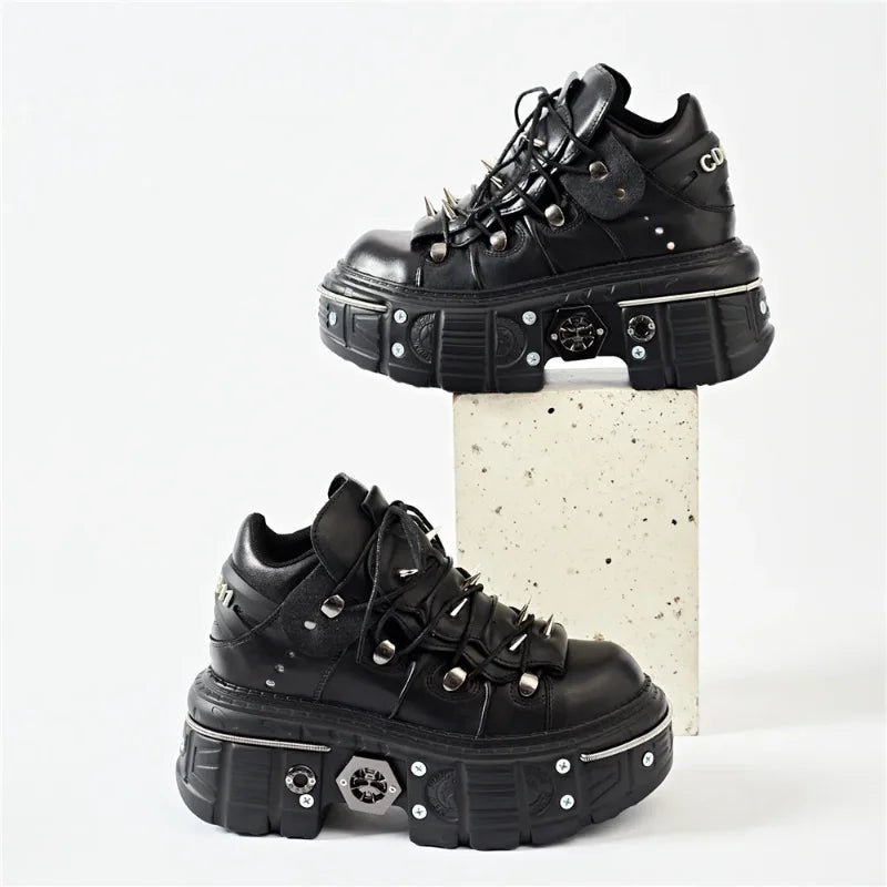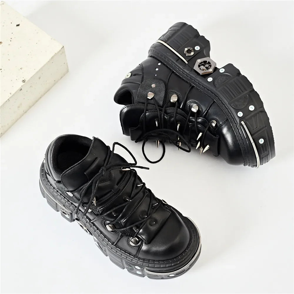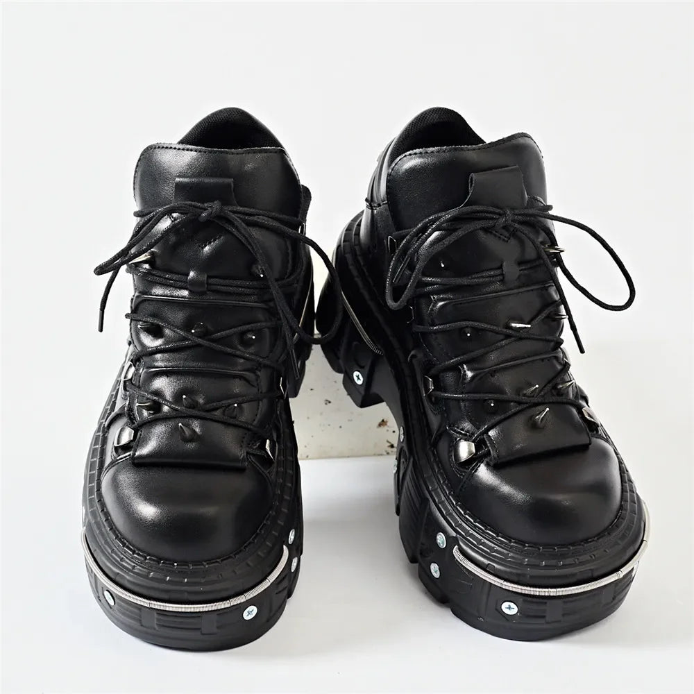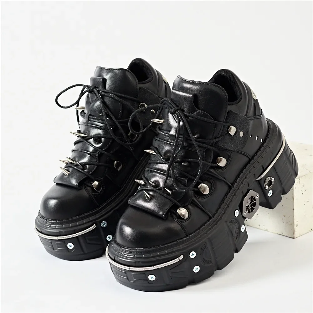 Punk Women Lace-Up Ankle Botas Mujer 2025 Rivet Metal Decoration Round Toe Thick Bottom Boots Woman Nightclub Rock Platform Shoe