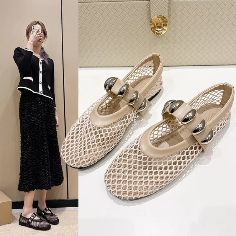 Spring New Flat Shoes Women Fashion Round Head Shallow Mouth Mesh Cloth Breathable Metal Buckle Soft Sole Single Shoes