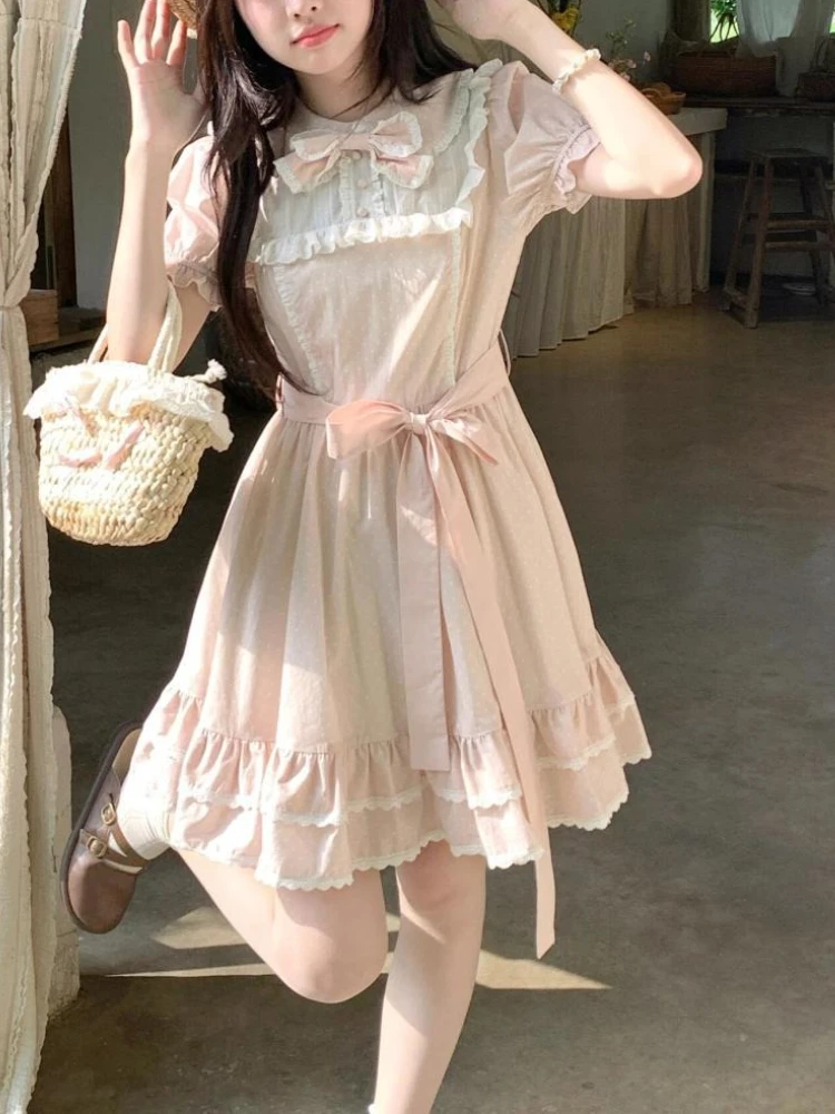 Summer Sweet Pink Puff Sleeve Bow Dress Women's Design Casual New Patchwork Dresses Elegant New Fashion A-line Short Dresses