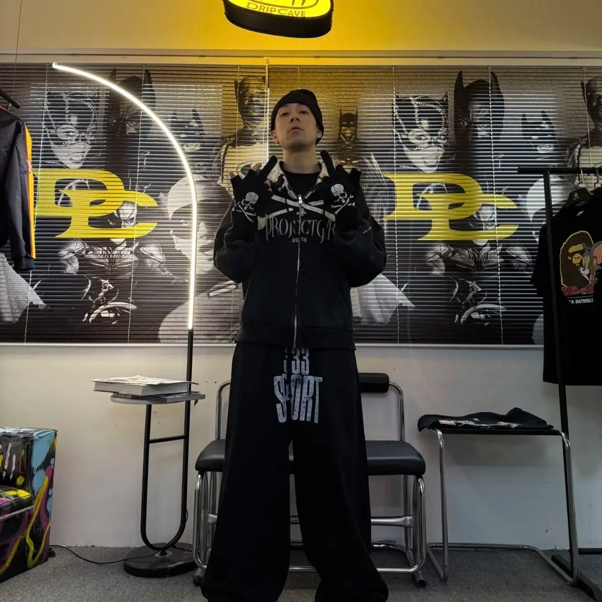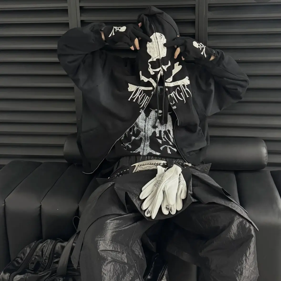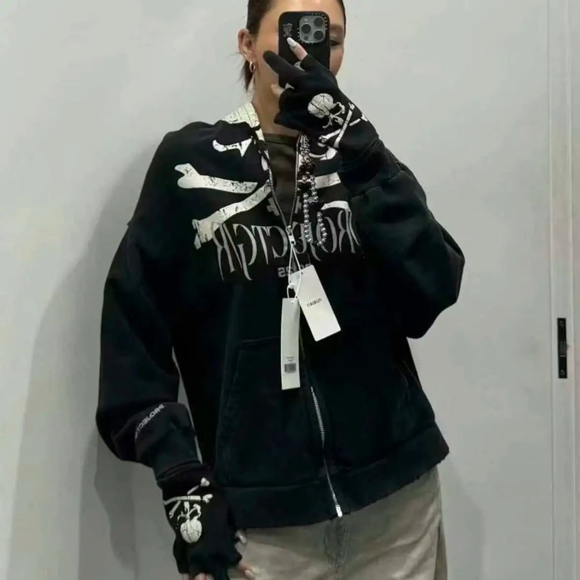 Wasteland style skull print hoodies women shoulder zipper cardigan hooded sweatshirt jacket oversized hoodie harajuku clothes