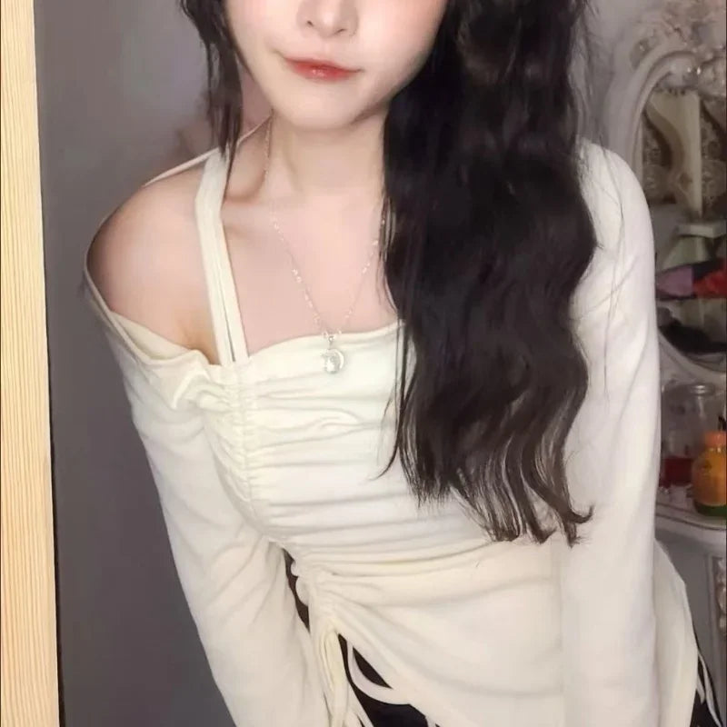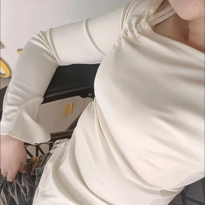 Women Spring Autumn Cotton Flare Sleeve T Shirts Solid Bodycone Basic Long Sleeve Crop Tops Casual Shirring Off-shoulder Tees